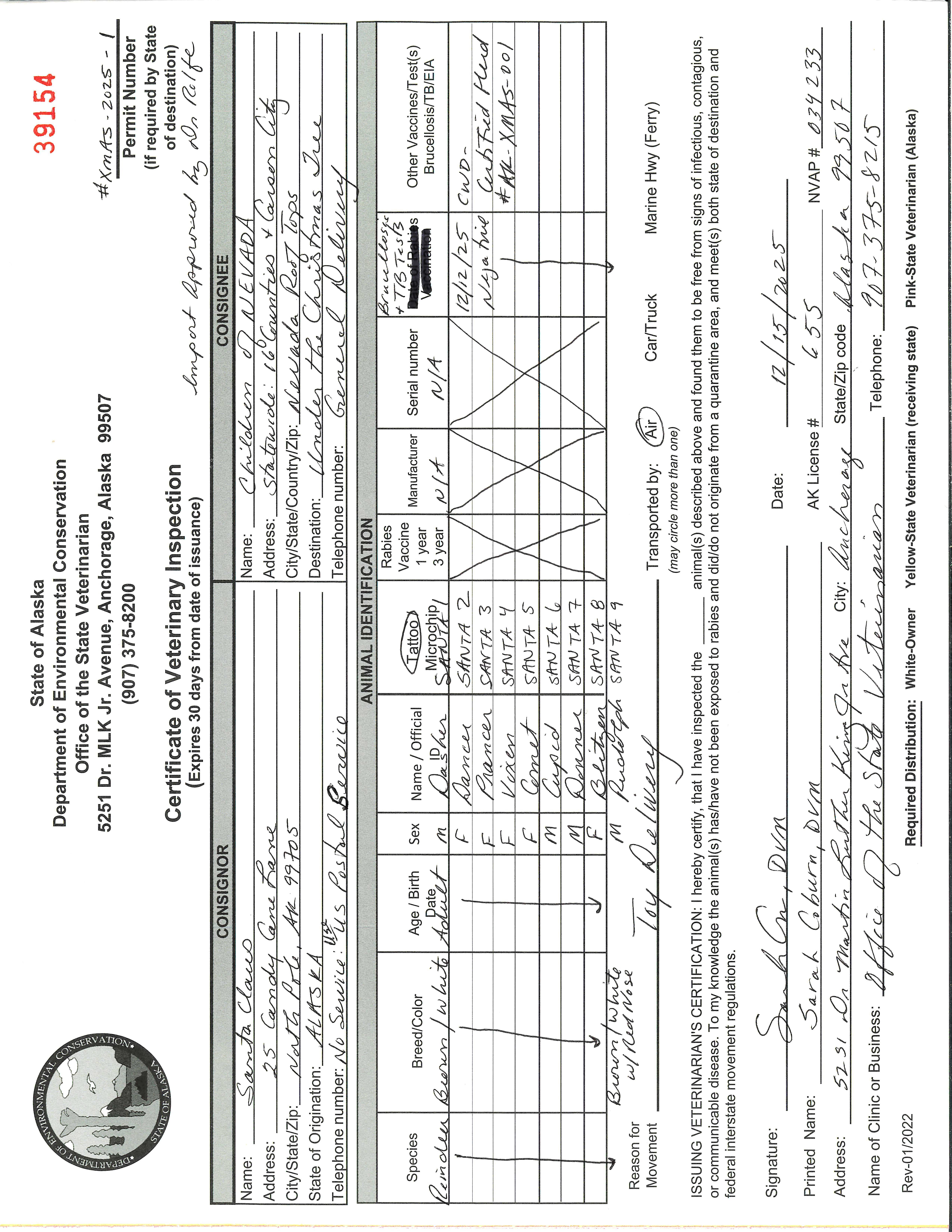 "We are happy to report that Dasher, Dancer, Prancer, Vixen, Comet, Cupid, Donner, Blitzen and Rudolph are in good health and are approved and ready to help Santa deliver presents to all the children in Nevada," said Dr. Rolfe.